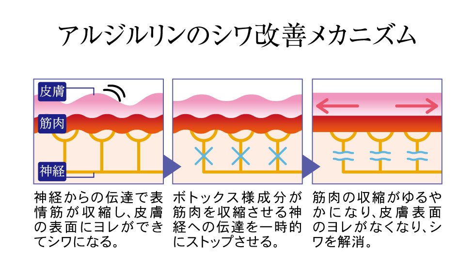 神経伝達物質(アセチルコリン)の放出を抑制してくれる効果があり、表情しわに働きかけます。(塗るボトックスとも言われています。)