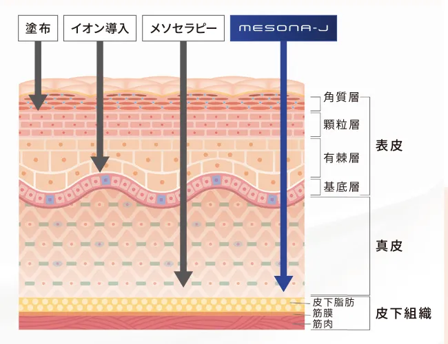 イオン導入ができるものはイオン化できるものと限られていますが、メソナJは痛みなく真皮深くまで大きな分子の導入が可能です✨
